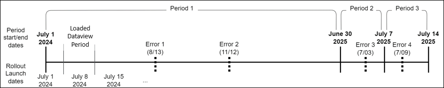 - Rollout Period(s): Dataview pulls in errors in the loaded Dataview period, as well as all other errors that occurred in the rollout event (includes all errors in schedule rollout periods that overlap with the loaded Dataview period).